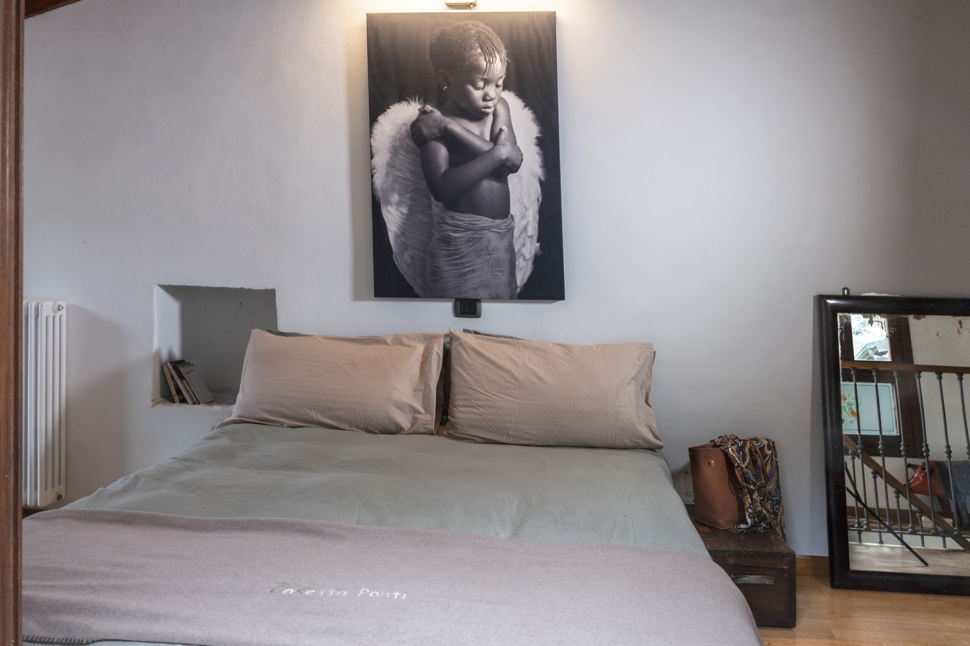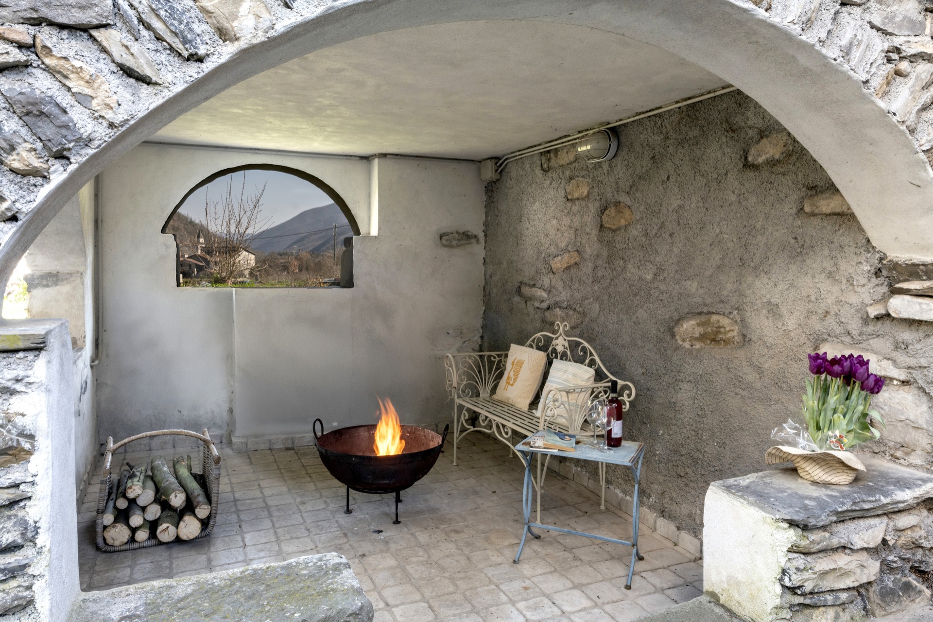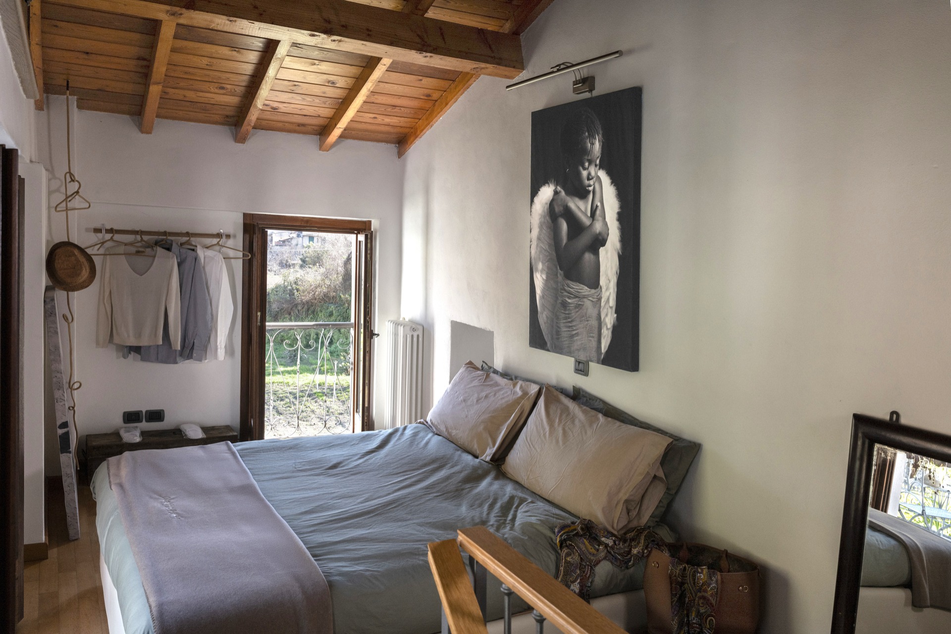 Cet élégant appartement se distingue par son plafond en bois avec des poutres apparentes, qui apporte chaleur et une atmosphère rustique. Les murs blancs et la vue sur les collines environnantes rendent l’environnement relaxant et lumineux. Les détails soignés, comme un coffre en bois, un miroir antique et des estampes d'auteur, confèrent un caractère unique et accueillant, plein de personnalité. La porte-fenêtre de la chambre s'ouvre sur une terrasse privée avec vue sur les montagnes et les toits en pierre de Pornassio, parfaite pour se laisser inspirer au réveil.