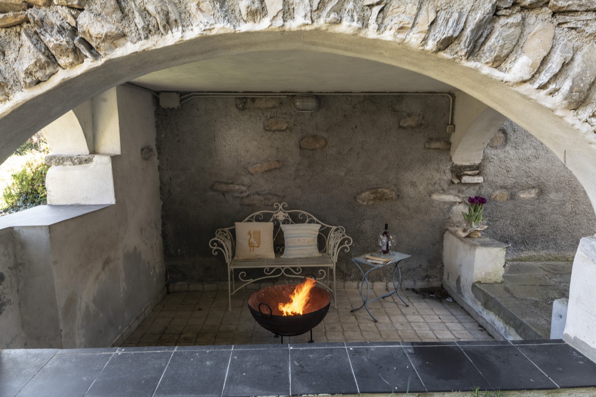 Il y a un porche avec un coin lecture et des jardins aménagés, et il est possible de garer la voiture grâce au parking privé.